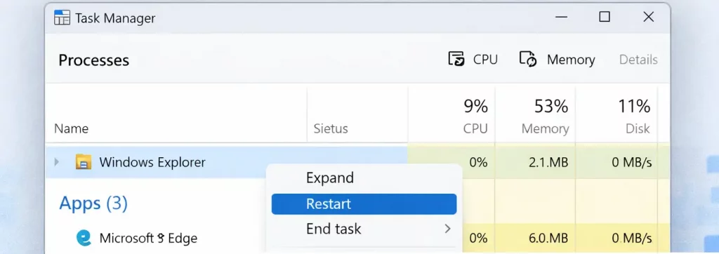 Explorer runs as a live process. Over time, it can get stuck waiting for previews, extensions, or background tasks. Restarting it forces Windows to reload Explorer in a clean state without restarting your PC.
